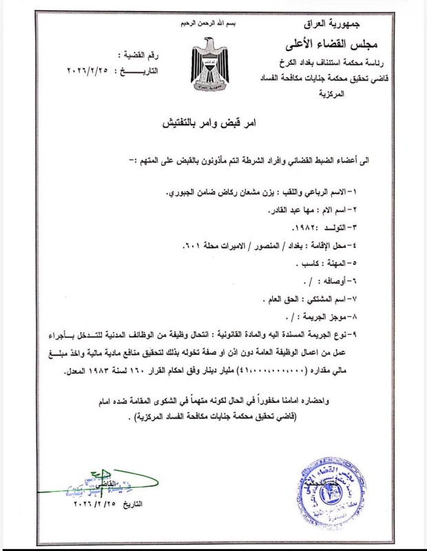وكالة الأنباء العراقية المستقلة بغداد ,, أعلنت محكمة تحقيق الكرخ، اليوم الخميس عن اصدارها مذكرة قبض بحق يزن مشعان الجبوري بتهم تتعلق بانتحال صفة والتدخل بعمل وظيفي لتحقيق منافع مالية. وبحسب الوثيقة ادناه والتي وردت لـ"وكالة الأنباء العراقية المستقلة فأن مذكرة القبض جاءت بتهمة تتعلق بانتحال صفة والتدخل بعمل وظيفي لتحقيق منافع مالية: