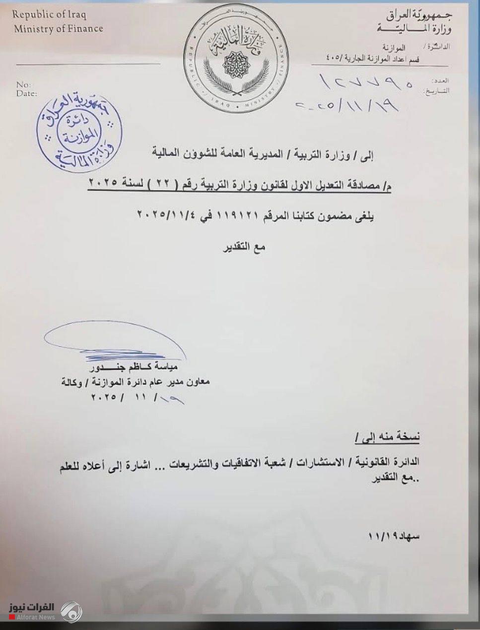 بالوثيقة ... المالية تصادق على قانون التعديل الأول لقانون وزارة التربية رقم (٢٢) لسنة ٢٠١١