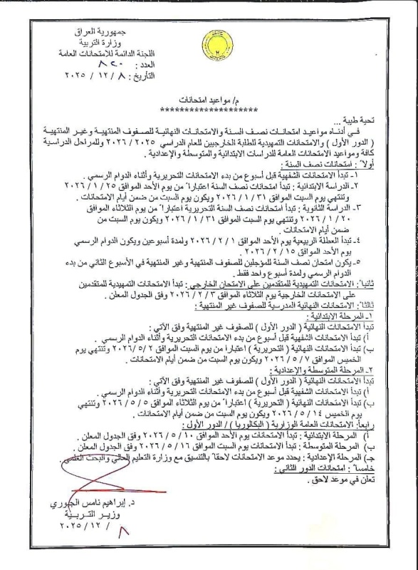 وأعلنت وزارة التربية مواعيد امتحانات نصف السنة والامتحانات النهائية للصفوف المنتهية وغير المنتهية (الدور الأول) والامتحانات التمهيدية للطلبة الخارجيين للعام الدراسي 2025 / 2026 وللمراحل الدراسية كافة، وفق الجدول أدناه: