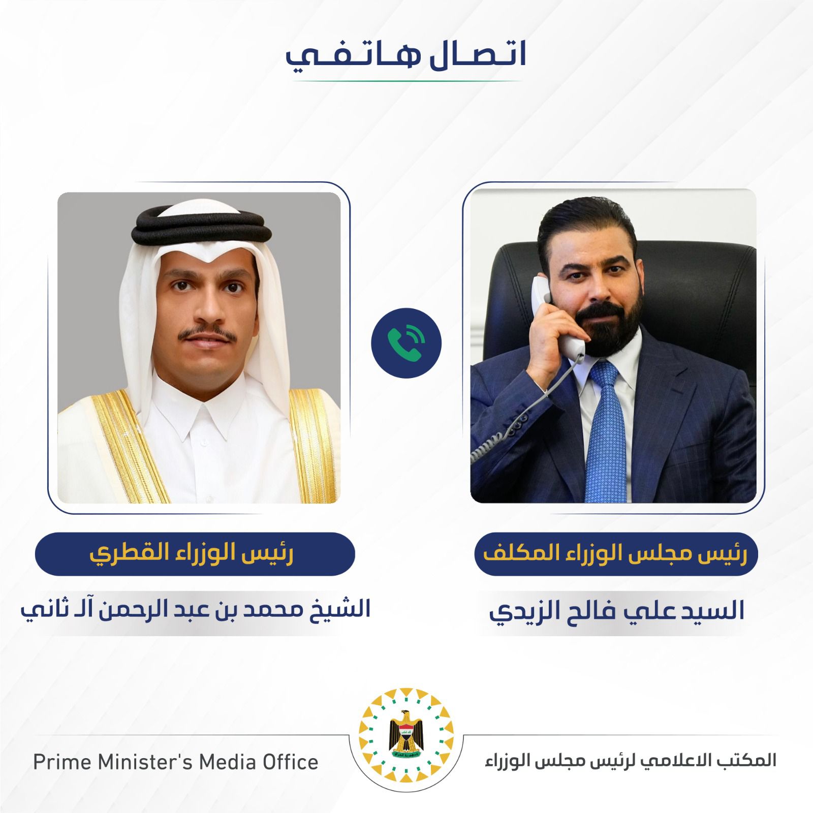 تلقى رئيس الوزراء المكلف السيد علي فالح الزيدي، مساء الثلاثاء، اتصالاً هاتفياً من رئيس مجلس وزراء دولة قطر الشيخ محمد بن عبد الرحمن آل ثاني، بمناسبة تكليفه بتشكيل الحكومة.