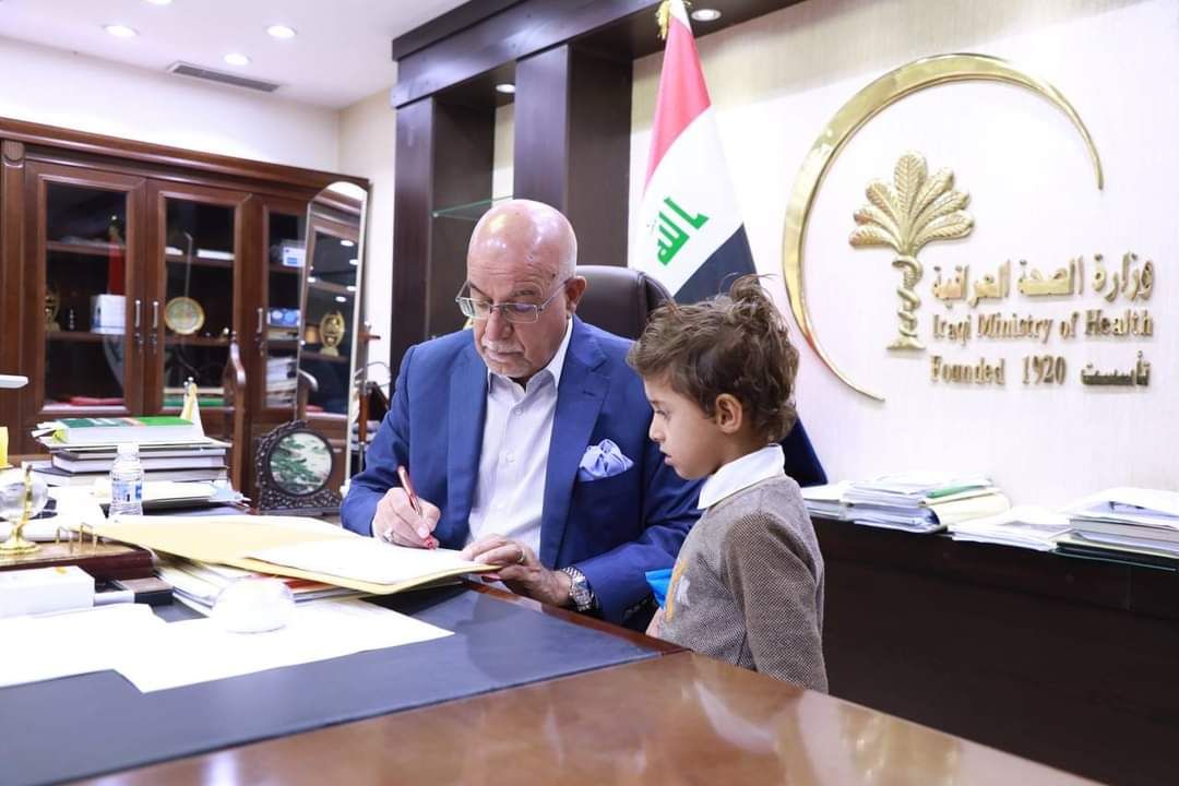 استقبل وزير الصحة صالح مهدي الحسناوي اليوم في مقر الوزارة ، طفلا من محافظة بغداد / قضاء ابي غريب / يحتاج الى اجراء عملية زراعة قوقعة اذن .