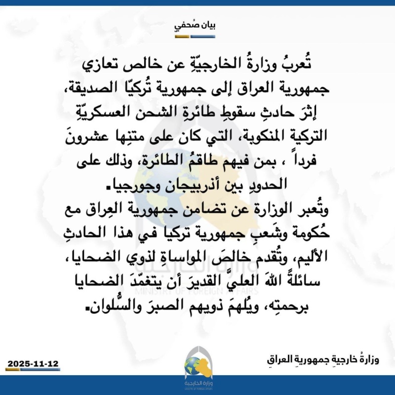 أعربت وزارة الخارجية العراقية، اليوم الأربعاء عن خالص التعازي إلى جمهورية تركيا، إثر سقوط طائرة شحن عسكرية تركية على الحدود بين أذربيجان وجورجيا، كانت تقل عشرين فرداً بينهم طاقم الطائرة