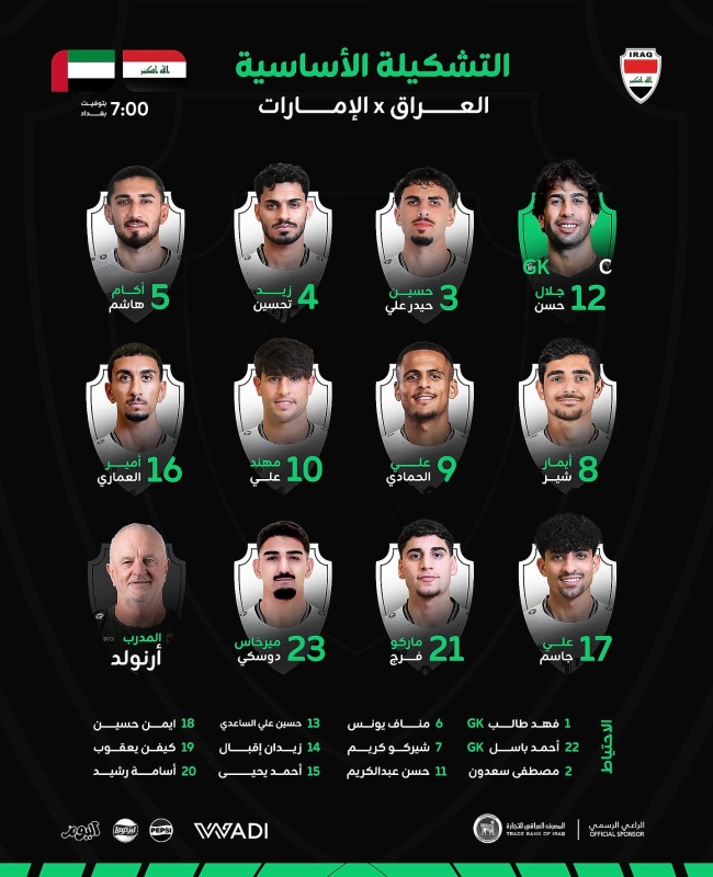 تنشر وكالة الأنباء العراقية، تشكيلة منتخبنا الوطني لمباراته أمام نظيره الإماراتي في الملحق الآسيوي والتي ستنطلق في تمام الساعة السابعة من مساء اليوم