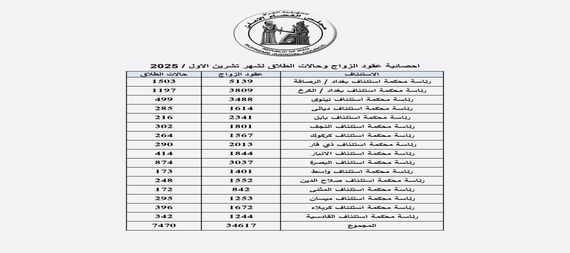 نشر مجلس القضاء الاعلى إحصائية الزواج والطلاق لشهر تشرين الأول لسنة 2025 .