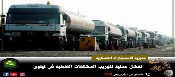 احبطت مديرية إلاستخبارات العسكرية عملية لتهريب المشتقات النفطية والقاء القبض على منفذها في نينوى.