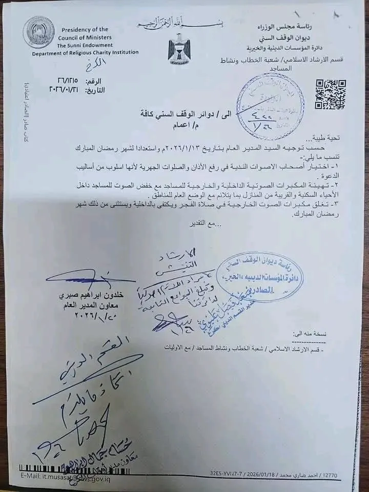 وكشف كتاب رسمي، صادر عن ديوان الوقف السني وموجّه إلى دوائر الوقف كافة، عن صدور توجيهات تقضي بخفض أصوات مكبرات الصوت في المساجد الواقعة داخل الأحياء السكنية والقريبة من المنازل، مع التأكيد على اختيار الأصوات الندية في رفع الأذان والصلوات الجهرية خلال شهر رمضان المقبل.