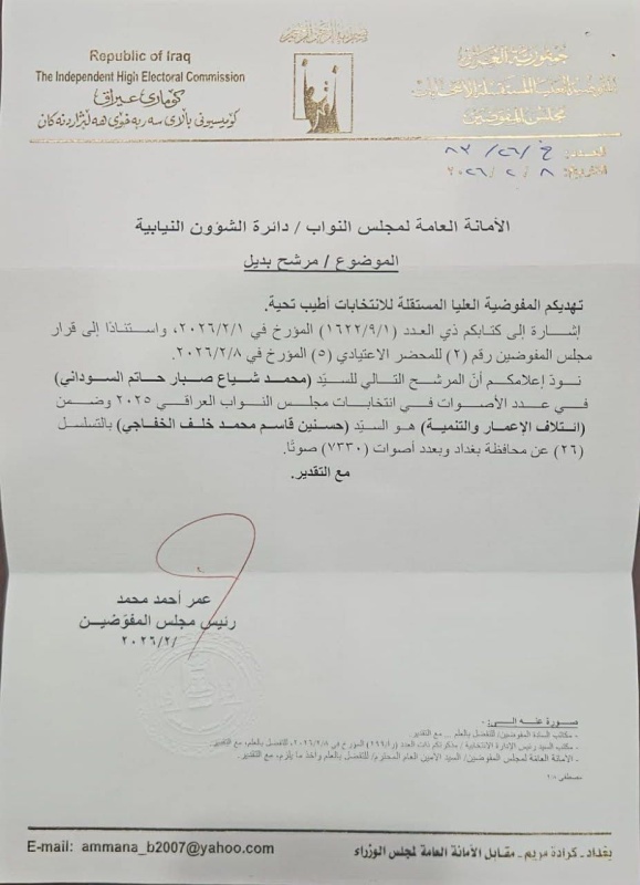 وكالة الأنباء العراقية المستقلة بغداد ,, أبلغت المفوضية العليا المستقلة للانتخابات، اليوم الأحد مجلس النواب بالاسم البديل لشغل مقعد رئيس مجلس الوزراء محمد شياع السوداني في البرلمان. وذكرت وثيقة صادرة عن المفوضية، تلقتها "وكالة الأنباء العراقية المستقلة أنها وجهت كتاباً إلى الأمانة العامة لمجلس النواب / دائرة الشؤون النيابية، تُبلغ فيه بأن المرشح التالي لرئيس مجلس الوزراء (محمد شياع صبار حاتم السوداني) في عدد الأصوات في انتخابات مجلس النواب 2025 وضمن (ائتلاف الإعمار والتنمية) هو (حسنين قاسم محمد خلف الخفاجي) بالتسلسل (26) عن محافظة بغداد وبعدد أصوات بلغ (7330) صوتاً". يذكر ان الأمانة العامة لمجلس النواب، أعلنت في الأول من شباط الجاري، تلقيها اعتذار مرشح ائتلاف الإصلاح والتنمية عن محافظة بغداد، محمد شياع صبار حاتم السوداني عن أداء اليمين الدستورية كنائب في البرلمان، وذلك لرغبته بالاستمرار بمنصب رئيس مجلس الوزراء في حكومة تصريف الأعمال.